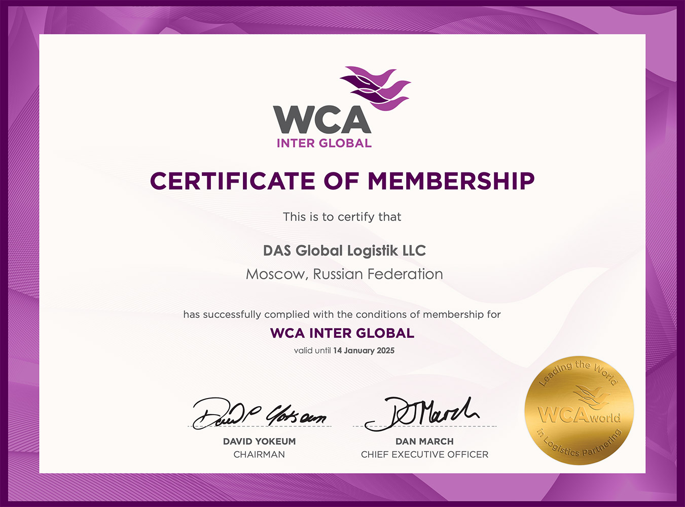 - Сертификат WCA PROJECTS, подтверждающий членство в международной ассоциации WCA PROJECTS по проектным грузам на 2025 г.